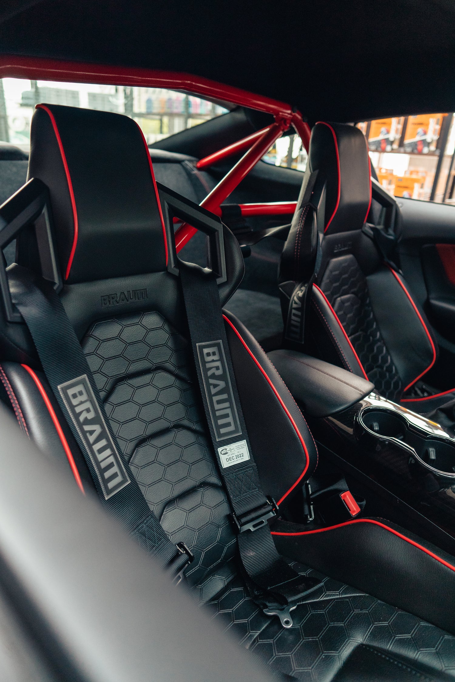 Geplant waren originale Recaros, die vom Lieferanten (vergessen) wurden von Werk aus eingebaut zu werden. Somit haben wir uns für noch sportlichere Sitze vom Hersteller BRAUM entschieden. Mit dezenten schwarzen 4 Punkt Gurten, die lediglich für Rennstrecken verwendet werden dürfen, schließen den Sitzbereich ab.