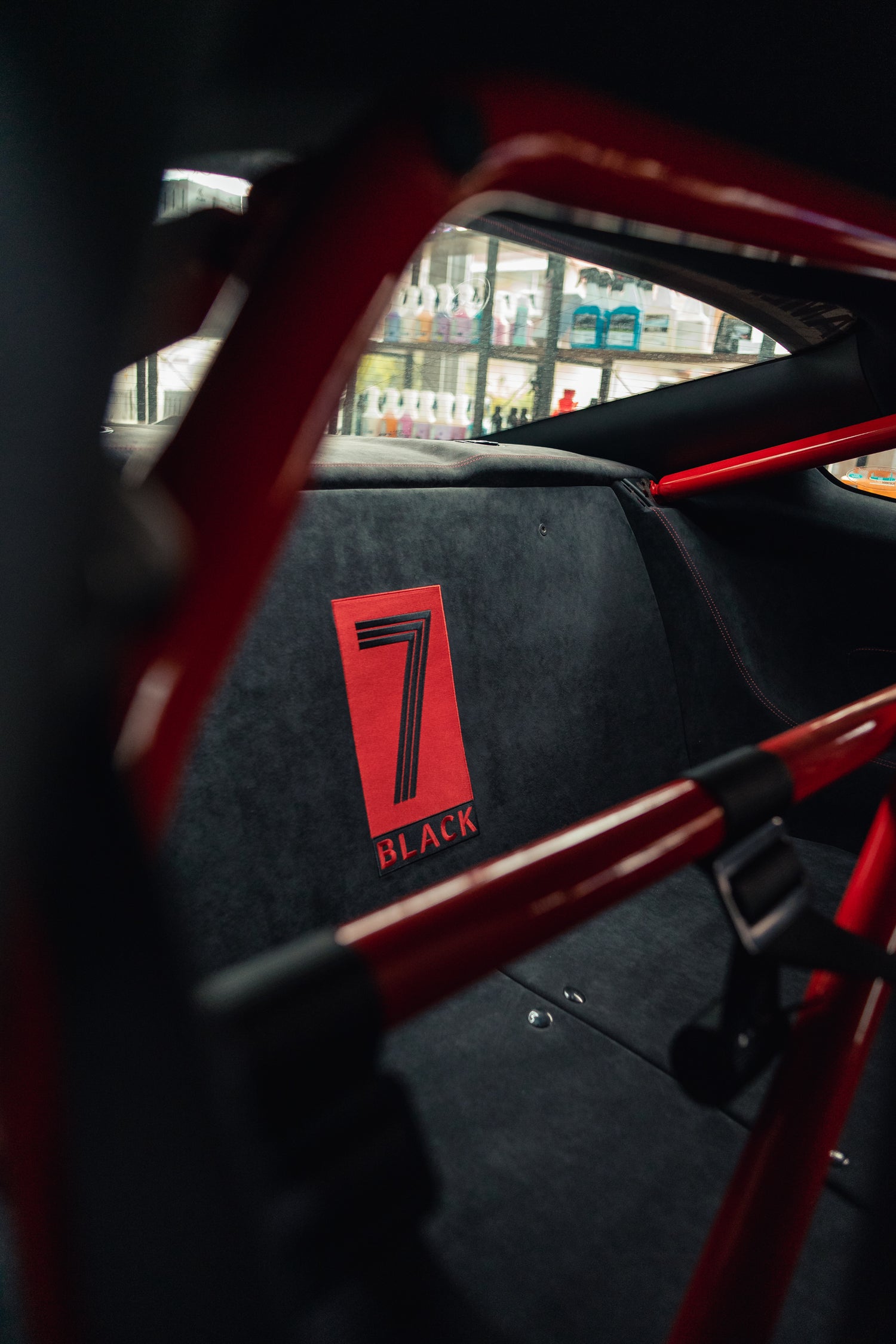 Die hintere Sitzbank wurde entfernt um Platz für einen Überrollbügel zu schaffen. Dieser wurde passend zur Innenausstattung lackiert. Von der Firma Neidfaktor sind einige Teile mit echtem Alcantara Leder bezogen worden, dazu wurde exklusiv ein BLACK7 Emblem in den hinteren Bereich gestickt/genäht.